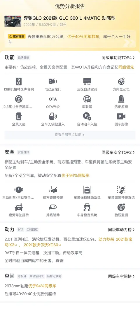 奔驰GLC(图片|配置|询价)可以说是一辆结合了豪华和实用性的SUV,从2015年登场,到现在已经销售了数百万辆。它的成功秘诀在于既能提供高端的驾乘体验,又能在日常生活中表现出色,无论是城市街道还是郊外小路,都能应对自如。今天要说的这辆二手奔驰GLC 2021款 GLC 300 L 4MATIC 动感型,报价29.55万,希望也能成为您的心头好。