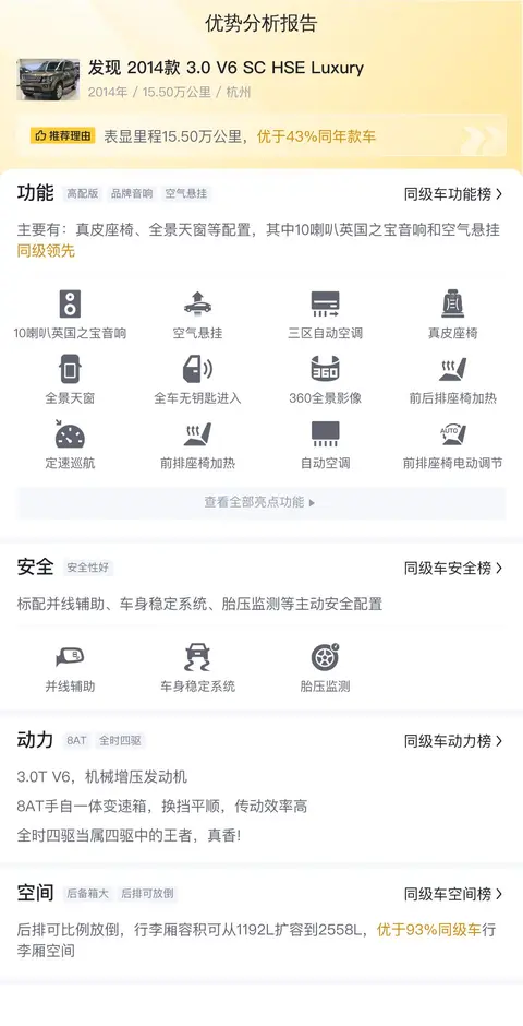 而这辆车呢,是2014年10月在杭州上的牌,至今已经跑了15.5万公里,这个里程数可不算少了哦!车子经过两次过户,车身是香槟色的,这个颜色挺特别的,看起来既时尚又有点低调的奢华感,我个人觉得还挺不错的。至于价格嘛,现在只要26.8万就能拿下,相比新车可是便宜了不少,如果你正好在找一辆性价比不错的发现四,那这辆车说不定就是你的“菜”哦!不过,既然是二手车,还是那句话,一定要看仔细了,确保车况良好,毕竟开得舒心才是王道嘛!