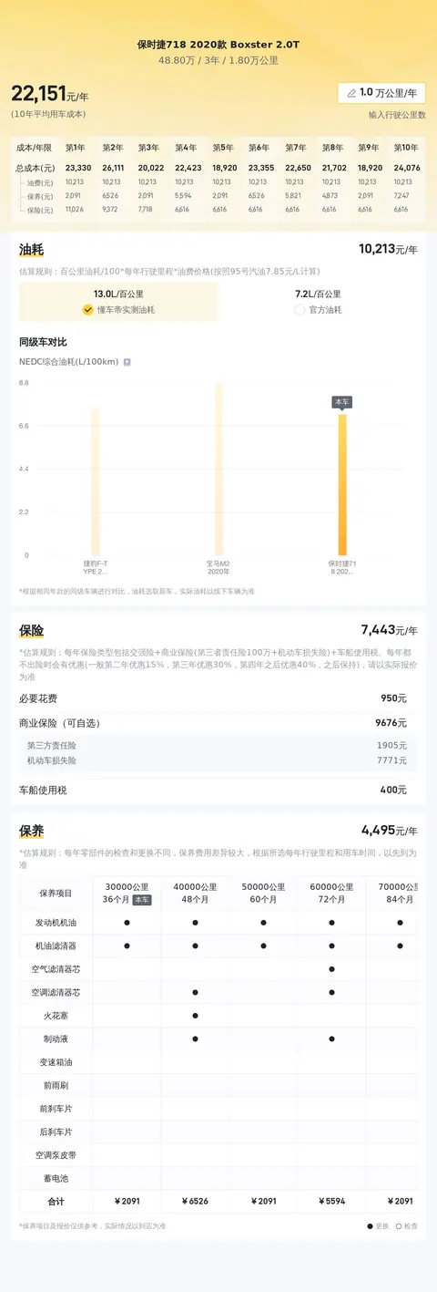 据估算,同级车的最低用车成本是14988元/年,最高是22786元/年,保时捷718 2020款 Boxster 2.0T是21681元/年,用车成本也较高。