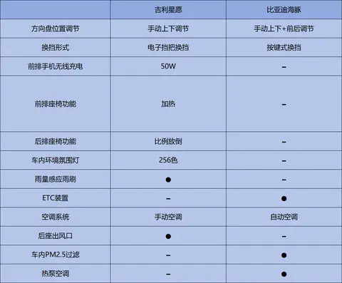 除了座椅,吉利星愿还多出了256色氛围灯、后座出风口等配置,细节上相当人性化,而对于比亚迪海豚来说,自动空调和更完备的空气质量过滤功能也是它的优势所在。