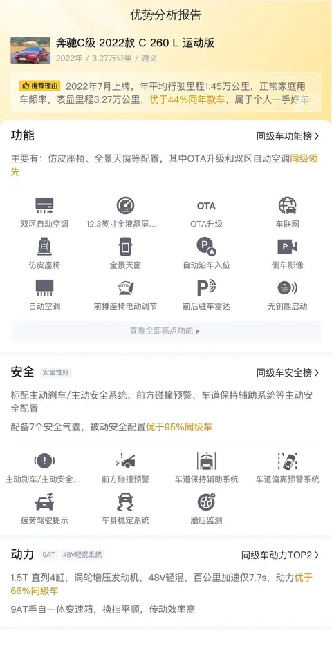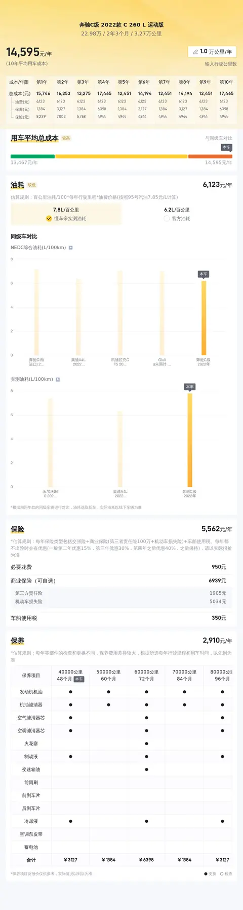 在用车成本方面,这款车的百公里油耗为6.35L,相对较低,燃油经济性表现不错。而且,这款车的保值率较高,未来几年内折价较少。因此,从长期使用的角度来看,这款奔驰C级2022款C260L运动版的用车成本是比较合理的。