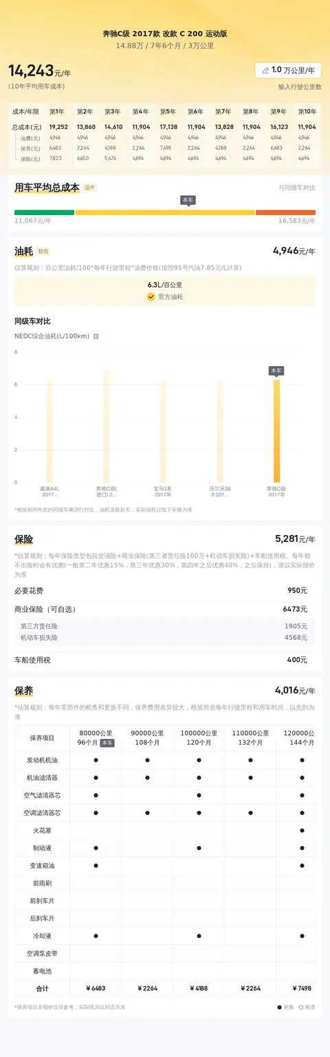 而在用车成本方面,根据懂车帝的大数据分析,这辆奔驰C级 2017款 改款 C 200 运动版的10年平均用车成本大约在1.41万/年,而本车的10年平均用车成本为14278元/年,与同级车相比处于适中的区间,并没有特别的压力。