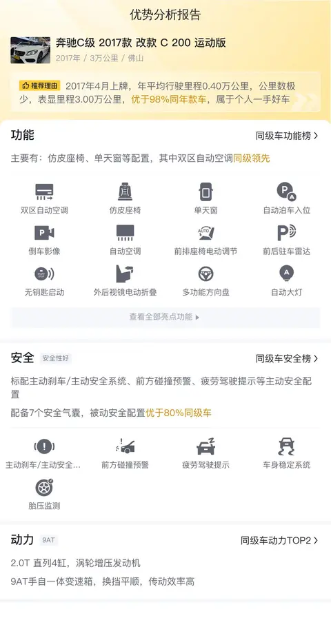 在优点方面,这台奔驰C级 2017款 改款 C 200 运动版因为是后驱车,再加上百公里7.7秒的加速成绩,所以整体驾驶感是非常不错的,而且底盘质感非常扎实,高速行驶的稳定性也非常棒。再加上这台车搭载了9挡手自一体变速箱,档位越多则代表换挡越平顺,因此这台车的乘坐舒适性也是非常高的。最后,因为这台车已经通过懂车帝多项检测,所以基本可以断定这台车不是事故车、不是泡水车、不是火烧车、更不是调表车,外观及内饰均为原厂配置,可以买得安心、开得放心!