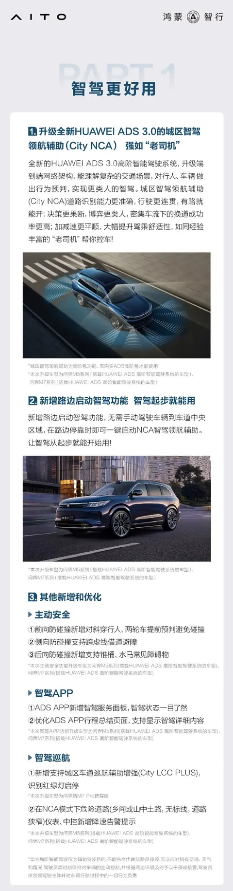 智驾辅助方面,本次升级了全新HUAWEI ADS 3.0,城区智驾领航辅助(City NCA)道路识别更准确,行驶更连贯。新增路边启动智驾功能,无需手动驾驶车辆到车道中央区域,在路边停靠时即可一键启动NCA智驾领航辅助。此外主动安全系统、智驾App和智驾巡航功能也迎来升级。