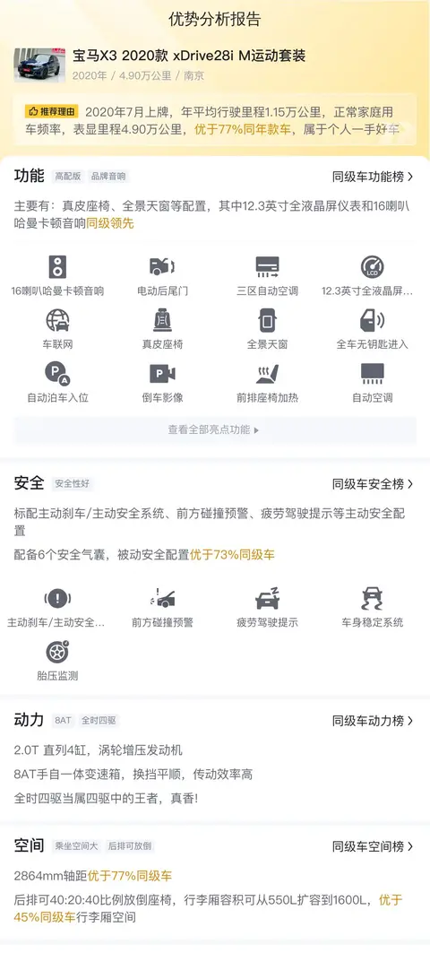 然而,需要注意的是,影响二手车价格的因素众多,包括车龄、里程数、车况、维护记录、市场供需关系以及地区经济水平等。因此,评估一辆二手车的价值时,不能单纯依赖某一个或几个因素,而应该综合考虑。对于潜在的买家来说,除了关注车辆的报价外,更应该亲自查看车辆的实际状况,了解其维护记录和历史使用情况,这些信息往往能更准确地反映车辆的真实价值。此外,与卖家的沟通也非常重要,了解卖家的出售动机、车辆的详细情况等,这些都有助于买家做出更明智的购买决策。总的来说,这辆二手宝马X3 2020款 xDrive28i M运动套装在市场上的表现值得肯定。它的合理报价、良好车况和较低里程数,都为其增加了购买吸引力。