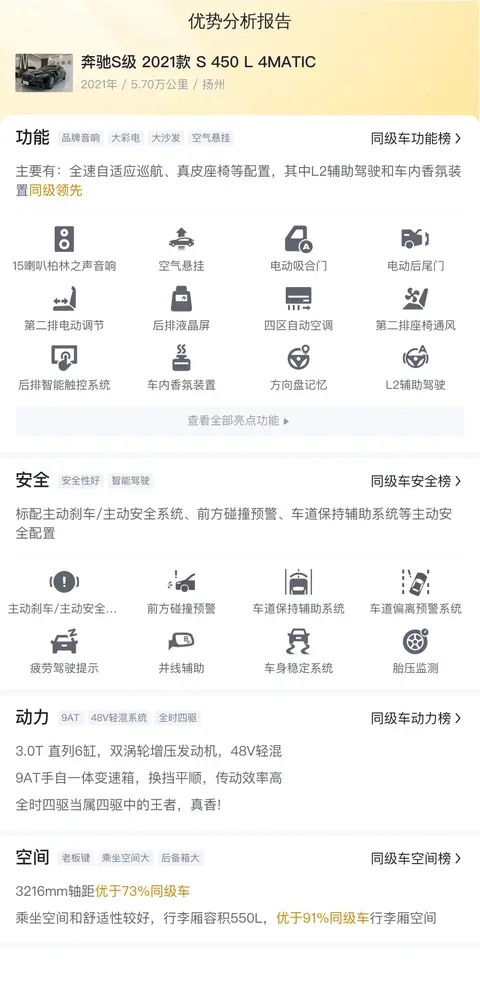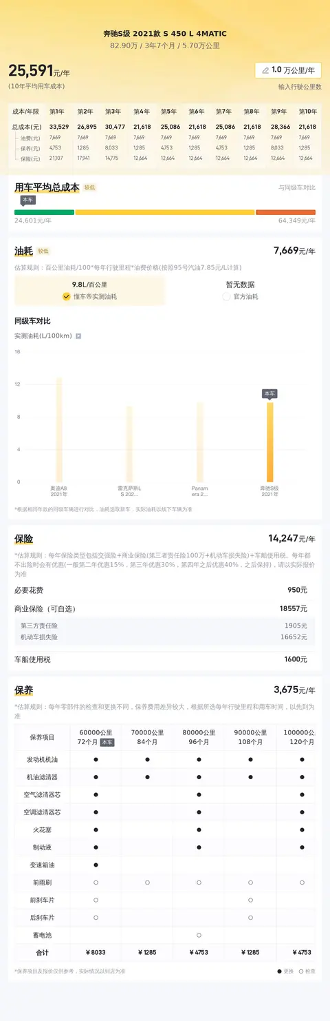 据估算,同级车用车成本最低是18798元/年,最高是46638元/年,奔驰S级 2021款 S 450 L 4MATIC是25658元/年,用车成本适中,主要是因为车子本身价值高。
