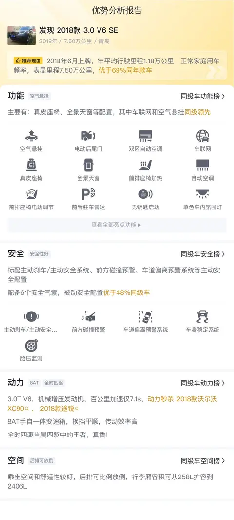 发现(图片|配置|询价),是路虎品牌旗下的一款中大型SUV,2004年正式进入中国市场开始销售。2017年之前为进口原装销售,2017年后以国产合资的形式在国内生产和销售。今天要说的这辆发现 2018款 3.0 V6 SE,是一辆中规版车型,也就是我们常说的原装进口车,不是平行进口车,这一点很重要,因为涉及到售后保障服务等事项,原装进口车是更有优势的。好了,话不多说,我们先来看看这辆二手发现 2018款 3.0 V6 SE的基本情况。