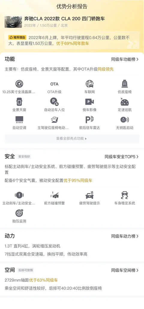 竞品对比方面,CLA 2022款 CLA 200 四门轿跑车在动力、安全、空间等方面均表现出色。与同级别竞品相比,如宝马2系Gran Coupe和奥迪A5 Sportback,CLA 200在性价比和品牌价值方面具有明显优势。