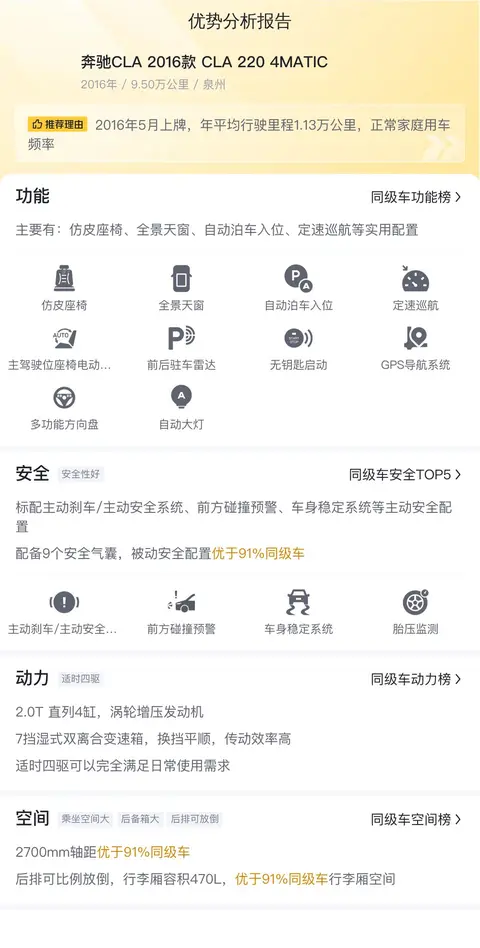 据估算,同级车的最低用车成本是12702元/年,最高是18120元/年,奔驰CLA 2016款 CLA 220 4MATIC是13684元/年,所以较低。