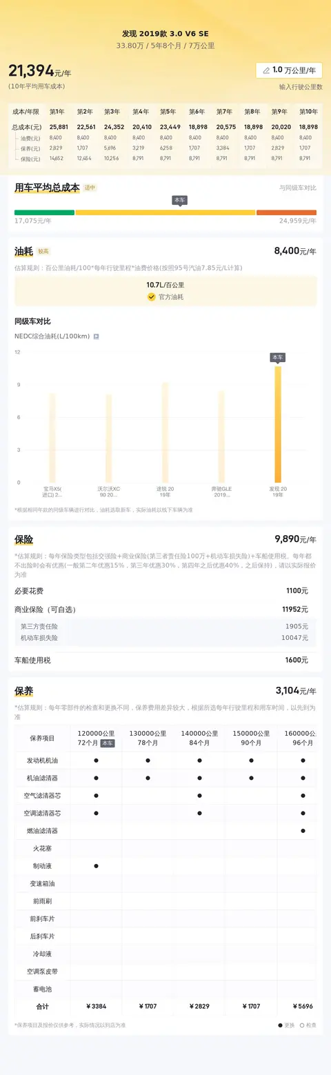 用车成本方面,根据估算,这辆车的年均综合用车成本约为2.1万元。这里同样为您准备了同款车型的用车成本对比情况,以便您进一步参考。