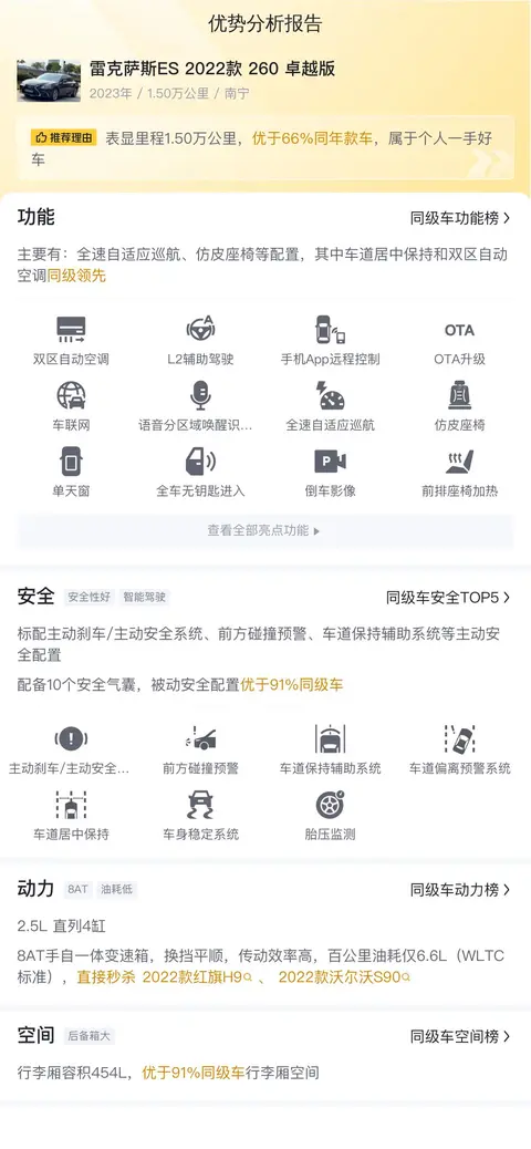 目前来说,这款雷克萨斯ES 2022款 260 卓越版的车况保持的很好,外观没有破损剐蹭,内饰功能也都正常,没有故障,准新车,里程也只有1.5万公里,整体来说比较好,不过价格还是有点高,大家根据实际情况慎重考虑。