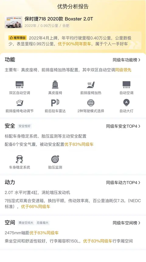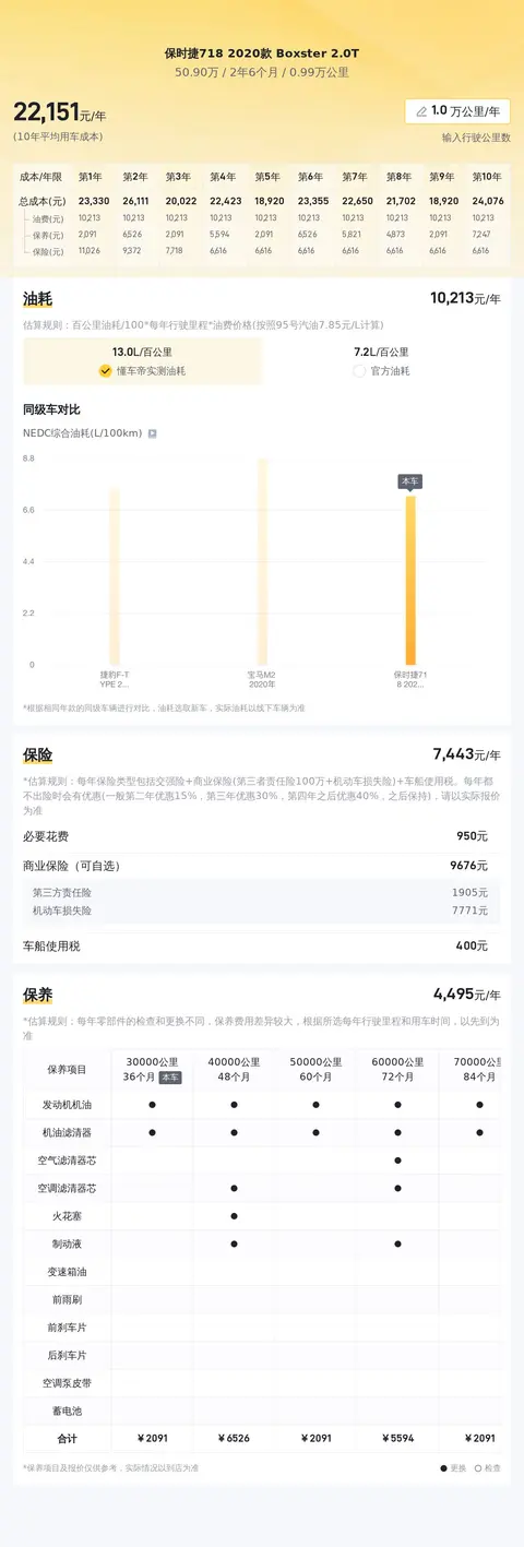 据估算,同级车的最低用车成本是14438元/年,最高是22780元/年,保时捷718 2020款 Boxster 2.0T是22780元/年,所以用车成本较高。