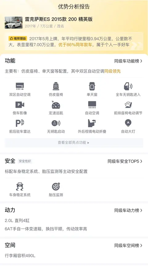 优势:雷克萨斯ES 2015款 200 精英版的市场行情价是13.99万-16.36万,它的报价则是11.80万,价格低于市场行情,加上里程不高,热度高。另外配置也比较全面,实用性比较高。油耗低,用车成本不高,养车容易。
