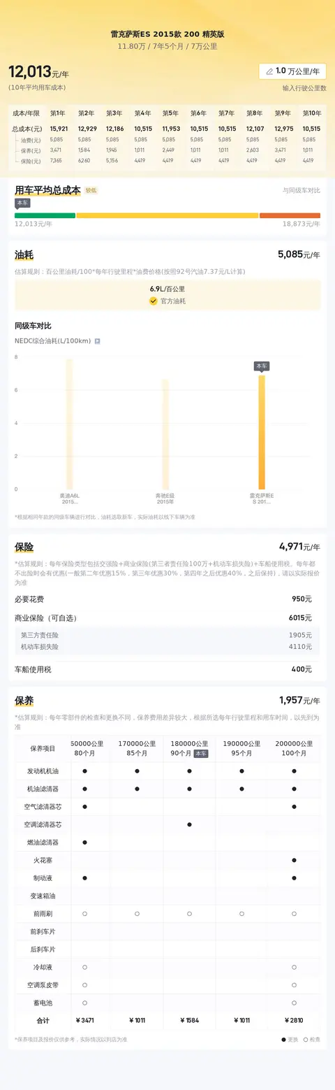 据估算,雷克萨斯ES 2015款 200 精英版的用车成本较低,因为同级车的最低用车成本是11468元/年,最高是20226元/年,而雷克萨斯ES 2015款 200 精英版是12454元/年,所以较低。