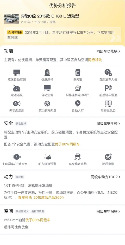 这辆奔驰C级2015款C 180 L运动型是一辆中型后驱轿车,首次上牌时间为2015年3月,上牌地为陕西榆林,表显里程12万公里,有1次过户记录,新车指导价32.58万,目前二手车报价11.5万元。