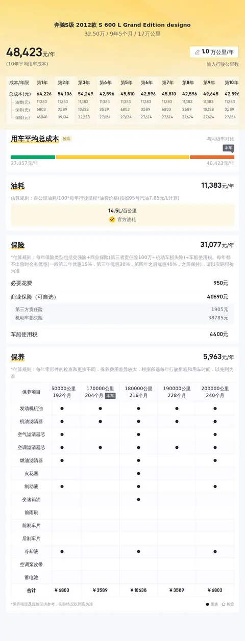 接下来,我们来探讨一下这款二手奔驰S级的市场行情和用车成本。目前,这款车的二手车行情大致在18万至30万之间。关于用车成本方面,根据估算,这辆车的年均综合用车成本在4.8万元左右。这里要说的是,这些数据仅供参考,具体的费用支出还是要根据车主的实际使用情况而定。另外,购买二手车时一定要重视车况检查,确保车辆的安全性和可靠性。