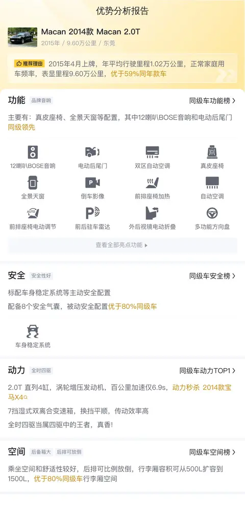 优点:保时捷的知名度不用多说,这辆Macan 的市场保值率也不错,外观好看,线条流畅,漆面完整,内饰豪华,没有明显的磨损痕迹,整体完整度很高,值得考虑。价格实惠,配置丰富,动力强劲,是一款集豪华与性能于一身的中型SUV。