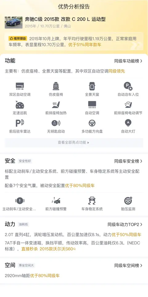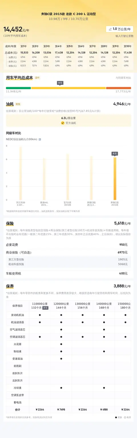 在购买二手车时,我们往往会关注车辆的历史、现状以及未来的使用成本。对于这辆奔驰C级而言,它有着近十年的车龄,这既意味着它曾经是一位车主的得力伙伴,也意味着它可能经历过一些自然磨损或小修小补。它的10年平均用车成本为每年19268元,这在中型车中属于较高水平。然而,考虑到奔驰品牌的豪华定位和这款车的保值率,这样的成本似乎又显得合理起来。毕竟,享受奔驰带来的尊贵体验和卓越性能,付出相应代价也是情理之中。所以,如果你对奔驰C级情有独钟,且已做好承担较高使用成本的准备,那么它或许仍是个不错的选择。但如果你更看重经济实惠和低维护成本,那么可能还需要再仔细权衡一下。毕竟,每一辆车都有其独特魅力和适用场景,只有最适合自己的才是最好的选择。