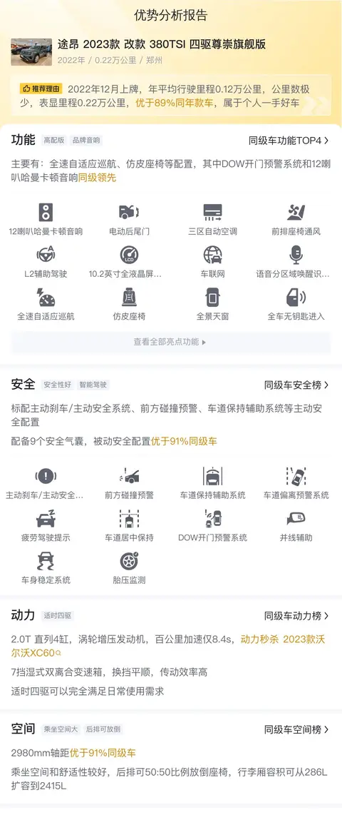 综上所述的新车含税价、用车成本、市场行情、优势分析、同款比价等数据仅供参考。在配置部分,因为二手车非标品,车辆可能会存在配置改装的情况,具体车况信息需要线下结合车辆实际情况进行综合参考。