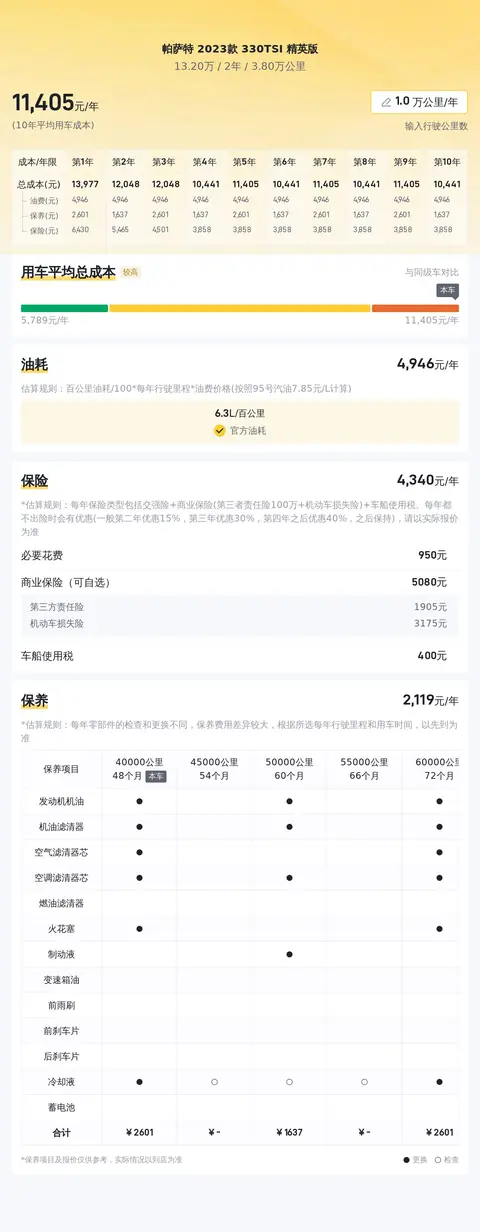 另外,据估算帕萨特 2023款 330TSI 精英版的用车成本也低,因为同级车的最低用车成本是6141元/年,最高是13446元/年,帕萨特 2023款 330TSI 精英版是11360元/年,所以较低。