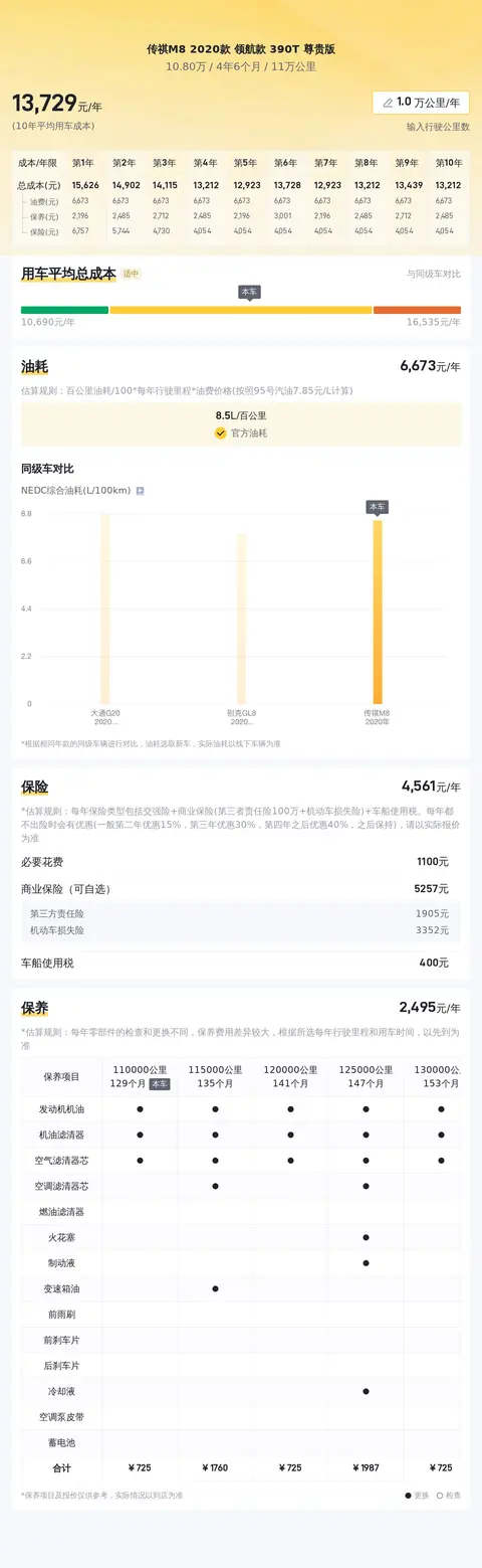 当前,这款传祺M8的二手车市场价格区间大致在10万至12万元左右。当然,具体的售价会受到车况、里程数及保养情况等因素的影响。关于用车成本方面,该车是一款中大型MPV,我们暂且按照每年行驶2万公里计算,大约每年的油费为14,000元,保养费用约为2,000元,保险费用参考值为5,000元,其他费用根据个人情况而定。这些成本估算仅供参考,实际花费可能会因多种因素而有所不同。