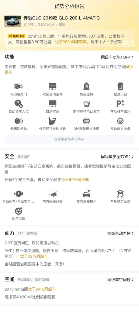 今天要介绍的这台奔驰GLC 2019款 GLC 200 L 4MATIC,上牌地、车源地均在广东揭阳,上牌时间为2019年5月,表显里程3.8万公里,0过户,白色车身深色内饰,新车指导价39.08万,这台二手车报价18.98万,过户次数0次,可做1-3年低息贷款,首付5.6万即可开回家。