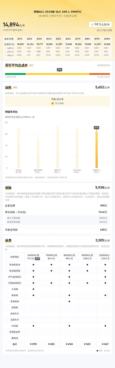 根据懂车帝平台数据,这款奔驰GLC 2019款 GLC 200 L 4MATIC的10年平均用车成本约为15185元/年,具体费用视使用情况及保养程度而定。