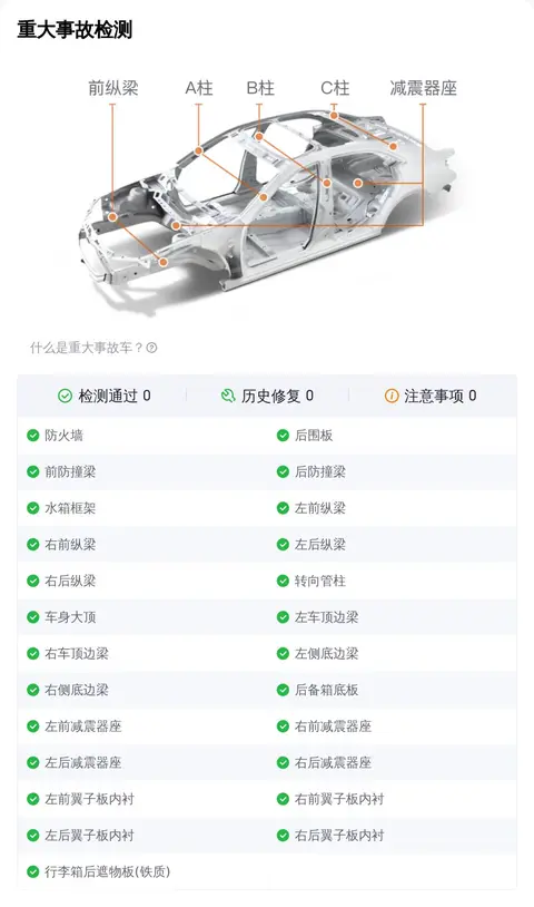 二手车不同于新车,在日常使用中难免会发生一些小意外。比较常见的就是车辆外观覆盖件划伤、剐蹭、划痕、喷漆修复、钣金修复、凹陷、变形等,对于此类小瑕疵,虽然在检测项中会被查出来判定为瑕疵项,但整体并不影响车辆的安全性。总结说一下,如果车辆通过了重大事故、泡水、火烧检测检测,那么说明这台车的整体车况没有大问题,这个您放心就行。