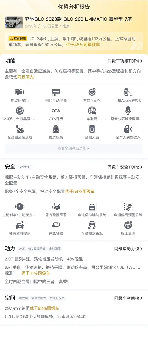 要说奔驰品牌中能疯狂赚钱的车型,轿车里数奔驰E级算是能手。在SUV市场,那就要看奔驰GLC(图片|配置|询价)了。数据显示,奔驰GLC在2021年共计销售140049台,仅次于宝马X3位列国内中型SUV销量榜第二名。而且奔驰GLC在过去的2023年第一季度,再次成为同级销冠,可见其市场受欢迎程度之高。今天要说的这辆奔驰GLC 2023款 GLC 260 L 4MATIC 豪华型 7座,是2023年6月上牌的车型,到现在一年多的时间,跑了1.5万公里,报价36.9万,价格不算低了。