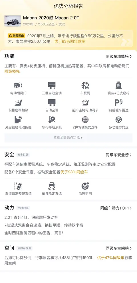 综上所述的新车含税价、用车成本、市场行情、优势分析、同款比价等数据仅供参考。在配置部分,因为二手车非标品,车辆可能会存在配置改装的情况,具体车况信息需要线下结合车辆实际情况进行综合参考。