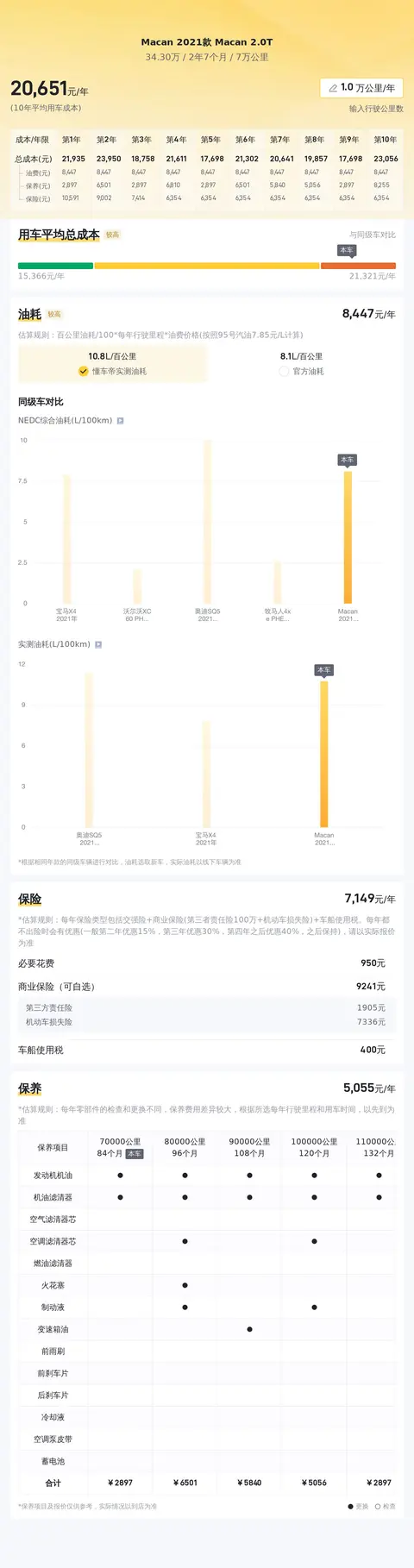 这辆Macan 2021款 Macan 2.0T,10年平均用车成本是21283元/年,同级车的最低10年平均用车成本是16464元/年,最高是21283元/年,所以它的用车成本也偏高,但毕竟是豪车,也属于正常。