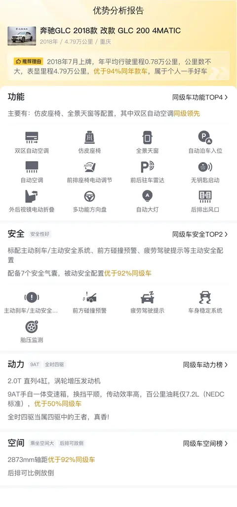 二手奔驰GLC 2018款 改款 GLC 200 4MATICasking price为17.98万,这款车凭借其出色的外观设计、豪华的内饰配置、强劲的动力性能以及卓越的驾乘感受,成为了一款理想的自驾旅行豪华SUV。这款车于2018年7月上牌,实表4.79万公里,无过户记录, asking price 为17.98万。作为一款豪华SUV,奔驰GLC 2018款 改款 GLC 200 4MATIC在二手车市场的asking price具有一定的竞争力。根据懂车帝的大数据分析,这款车的售价在二手市场中属于较为合理的价格区间。然而,具体售价还会受到车辆状况、行驶里程、保养记录等因素的影响。因此,在购买二手车时,建议消费者要全面了解车辆的情况,包括车辆的历史记录、事故记录、维修记录等,以确保所购买的车辆质量可靠。同时,也可以考虑找专业的第三方机构对车辆进行检测和评估,以帮助消费者做出更加明智的购买决策。