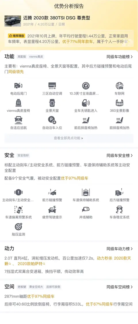 据估算,同级车的最低用车成本是6506元/年,最高是15783元/年,迈腾 2020款 380TSI DSG 尊贵型是12260元/年,用车成本适中,不占优势。