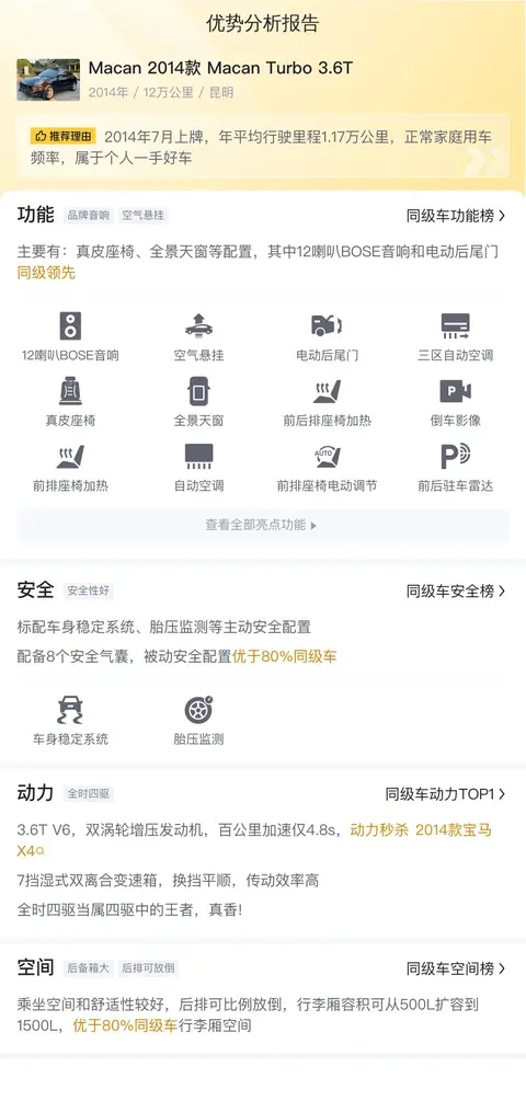 毕竟这辆Macan 2014款 Macan Turbo 3.6T首次上牌时间是2014年,距今行驶了12万公里,对于这种精密制造的高性能车型来说,后期的维修和保养成本可能会较高。