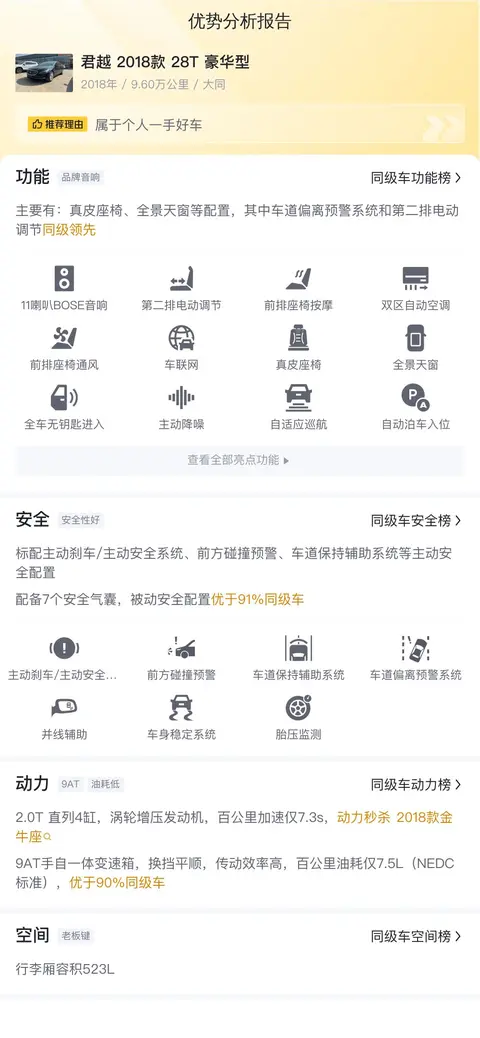 综上所述的新车含税价、用车成本、市场行情、优势分析、同款比价等数据仅供参考。在配置部分,因为二手车非标品,车辆可能会存在配置改装的情况,具体车况信息需要线下结合车辆实际情况进行综合参考。