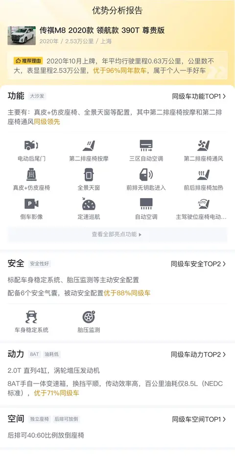 基础信息这辆传祺M8 2020款领航款390T尊贵版是一辆中大型MPV,车身颜色为白色,上牌日期是2020年10月,牌照及车辆所在地在上海,该车符合国六排放标准。至今累计行驶里程仅为2.53万公里,按照每年行驶1万公里计算,这辆车相当于跑了不到3年,车况还比较新,并且过户次数为0次,属于一手车源。这辆车当时的新车指导价为21.98万元,如今的二手车报价为12.88万元,相比新车价格便宜了9.1万元。