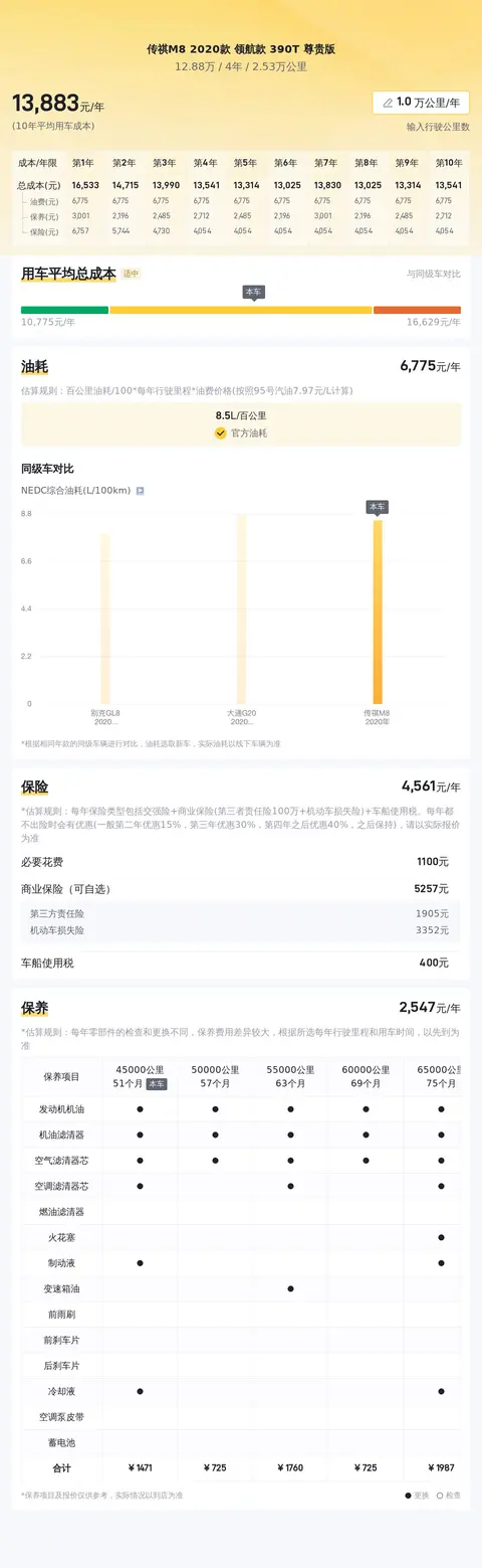 在用车成本方面,这辆传祺M8 2020款领航款390T尊贵版按照每年行驶2万公里计算,包括保险、日常保养以及燃油费用等在内的平均年度用车成本约为1.6万元左右。具体费用开销根据不同用车强度和地区消费水平会有所差异。