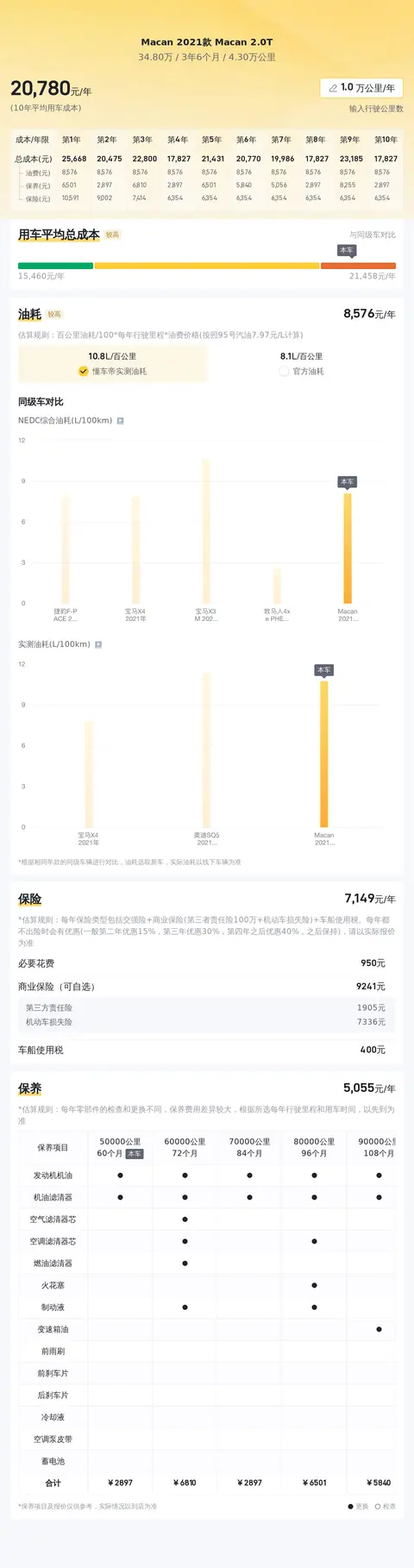 据估算,Macan 2021款 Macan 2.0T的用车成本是20538元/年,而同级车的最低用车成本是17060元/年,最高是22716元/年,所以它的用车成本不算低。