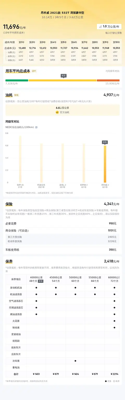 综上所述的新车含税价、用车成本、市场行情、优势分析、同款比价等数据仅供参考。在配置部分,因为二手车非标品,车辆可能会存在配置改装的情况,具体车况信息需要线下结合车辆实际情况进行综合参考。