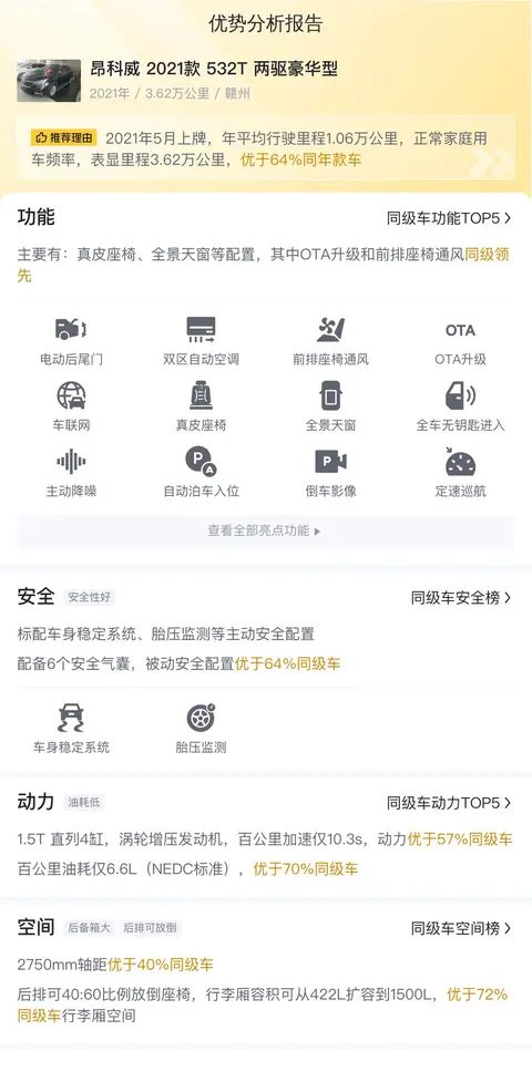 该车与2021年5月在赣州上的牌照,表显里程3.6万公里,有1次过户记录。昂科威 2021款 532T 两驱豪华型的新车指导价为20.99万元,如今二手车报价10.14万元。