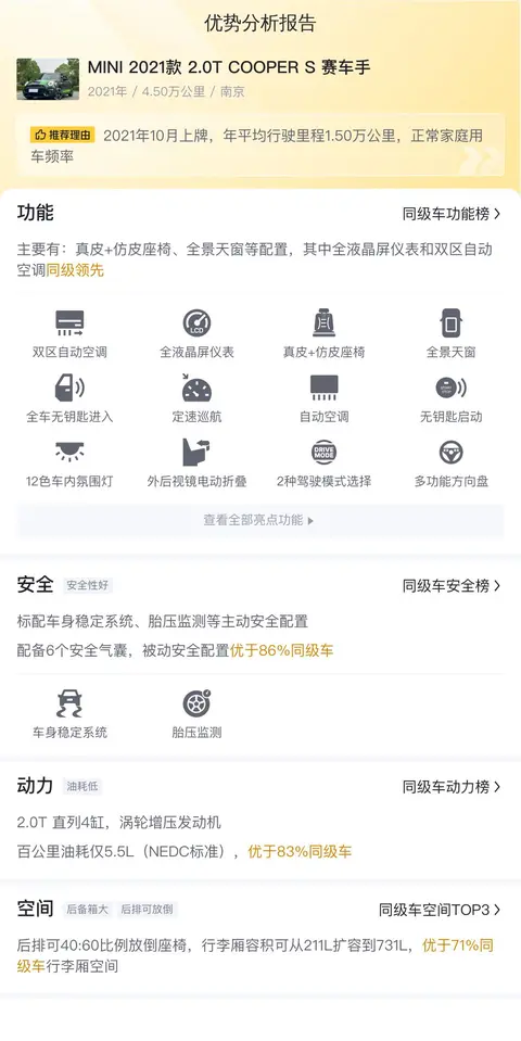 同时根据估算,MINI 2021款 2.0T COOPER S 赛车手10年的用车成本是11506元/年,这也算是正常水准。