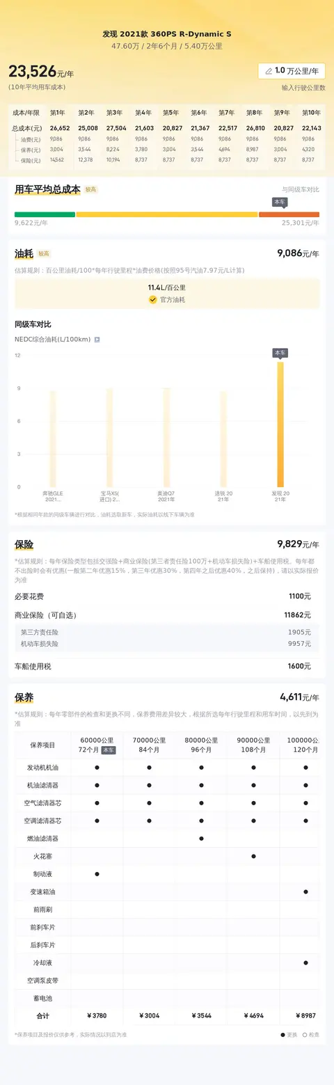 在用车成本上,这辆车的官方公布的百公里油耗为11.4升。我们暂且按照每年行驶2万公里,当前油价8.26元/L计算,每年约需油费18116元。在保养上,每年约需保养费用5088元,保险费用方面,每年约需支付车险费用9704元。综上,在不考虑其他任何费用的情况下,平均每年的用车成本大约在32908元左右。