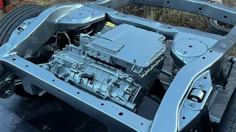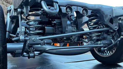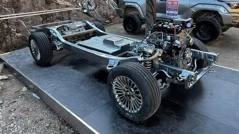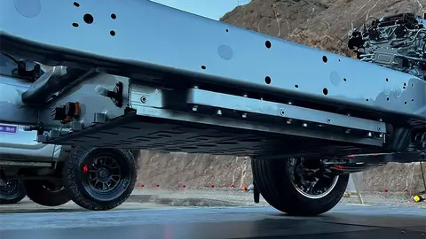 聊完动力,接下来就要看这套架构的越野能力了。作为一台拥有非承载车身的硬派越野车,底盘的戏份自然少不了,尤其是换上了大规格电池的电四驱越野车。由于发动机、变速箱依然是纵置,并且P2电机和发动机高度集成,所以前轴的空间压力要相对小一些,前悬继续用双叉臂式也没有什么问题,关键在车架后方,在大功率P4电机出现后,后轴在空间和调教上的压力就明显上来了。