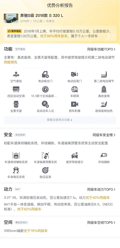 据估算,同级车的最低用车成本是18798元/年,最高是41611元/年,奔驰S级 2018款 S 320 L是20578元/年,所以用车成本较低。