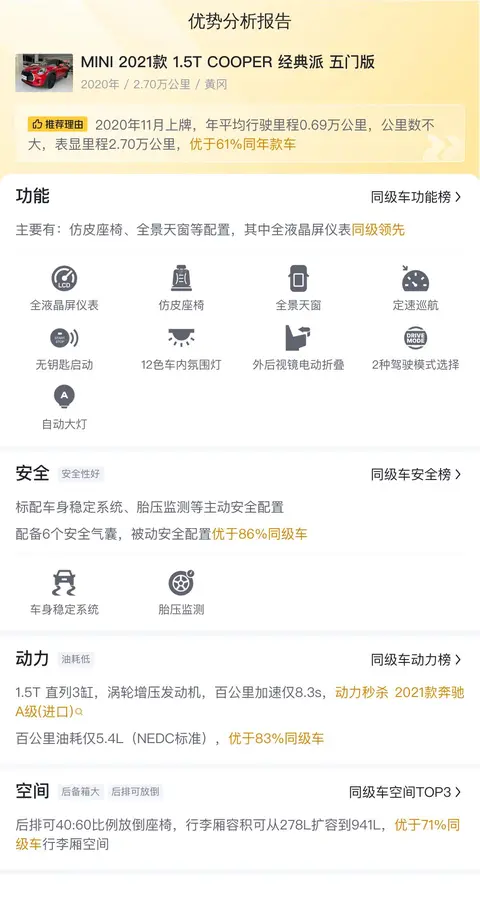 当前的市场行情显示,这款MINI的二手车价位大致在12万至14.7万之间,我们这辆标价14.98万,虽说价格偏高,但考虑到它可爱的外形和不错的保值率,还是挺有吸引力的。说到用车成本,这辆MINI油耗在5.4L/100km左右,保险加保养大约每年7307元,算是经济适用型,不会给你钱包太大压力。