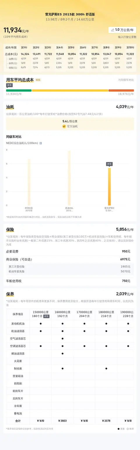据估算,雷克萨斯ES 2015款 300h 舒适版的用车成本较低,因为同级车的最低用车成本是11468元/年,最高是21130元/年,而雷克萨斯ES 2015款 300h 舒适版是12278元/年,所以较低。