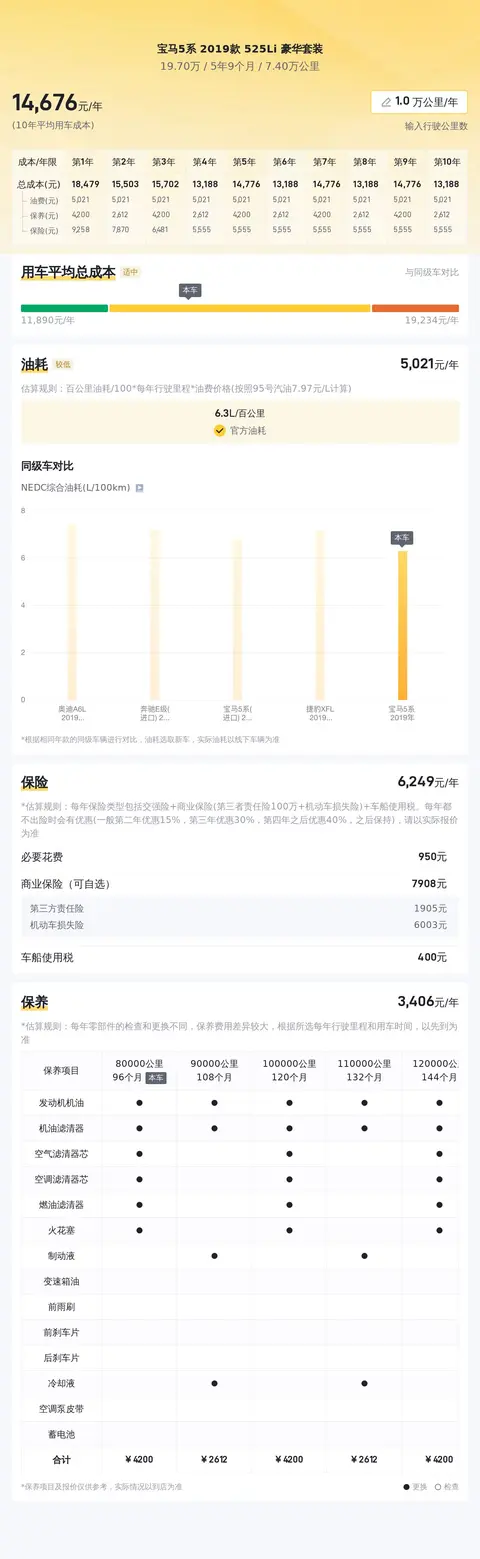 据估算,同级车的最低用车成本是7105元/年,最高是16783元/年,宝马5系 2019款 525Li 豪华套装是15138元/年,所以用车成本较高。