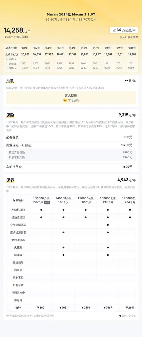 据估算,Macan 2014款 Macan S 3.0T的用车成本是3118元/年,算是正常水准,可以接受。