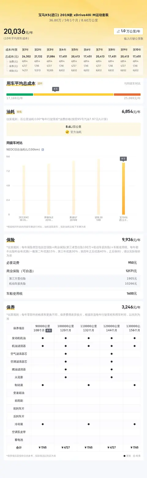基于懂车帝对宝马X5(进口) 2019款 xDrive40i M运动套装的分析,我们估测的年均综合用车成本大约为2万元左右,但实际开销可能会根据使用强度、环境条件等多种因素有所变动。