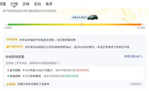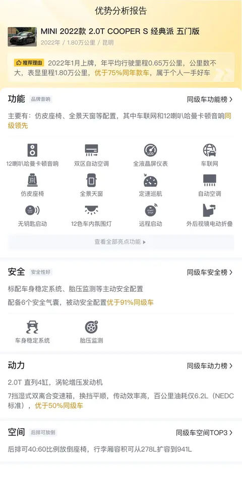 该车是2022年1月上牌的黑色MINI 2022款 2.0T COOPER S 经典派 五门版,车源和车牌都是昆明的,至今行驶了1.8万公里,0过户记录。这辆二手MINI报价19.8万元,比新车指导价便宜了8.68万元。